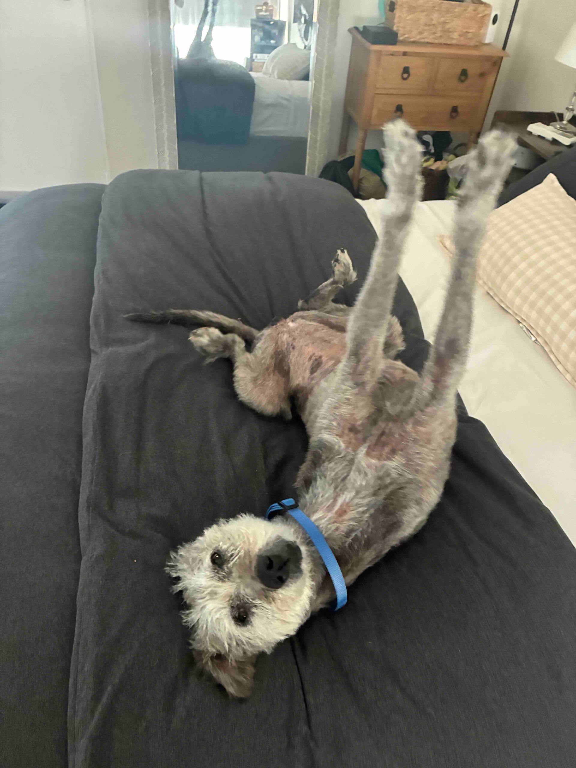 Here’s Essie!!! She was found near our store covered in fleas, with inflamed skin, no fur and starving. After holding her, nobody has claimed her and now she’s officially a Maeday dog thanks to her new Fosters! She is so happy & grateful to be cared for and loves everyone she meets