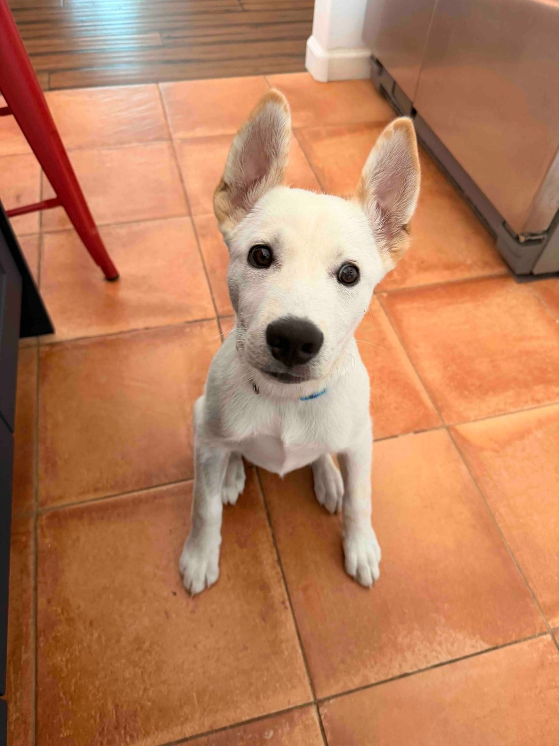 because they all had blue paint on their bodies. They were found in downtown LA and Skid Row and we took them in at about two months old. Behr was born with a rare, genetic mutation where they had both female and male genitalia. They had a reconstructive surgery in the beginning of March and are now fully healed. They are now biologically a female dog, and the vet is confident that she will have no major health complications in the future. She is a typical puppy who is very smart, loves other dogs, good with cats and is already understanding potty training. Her adopted sibling’s parents did their DNA and she is husky, lab and Shepherd. #maedaybehr