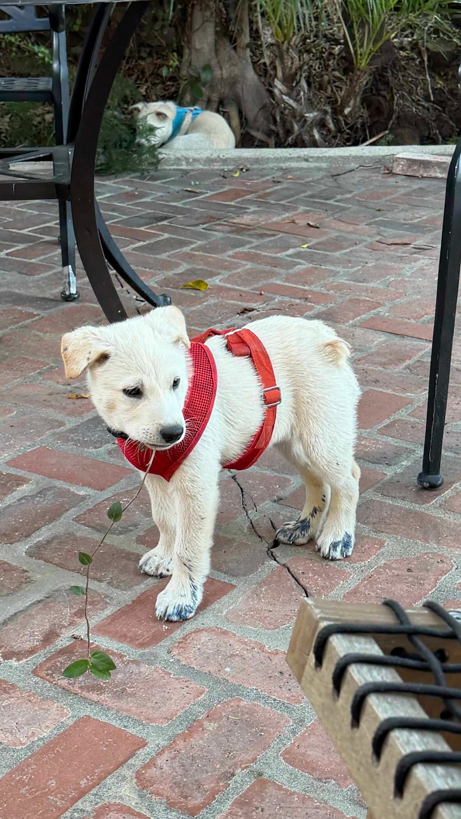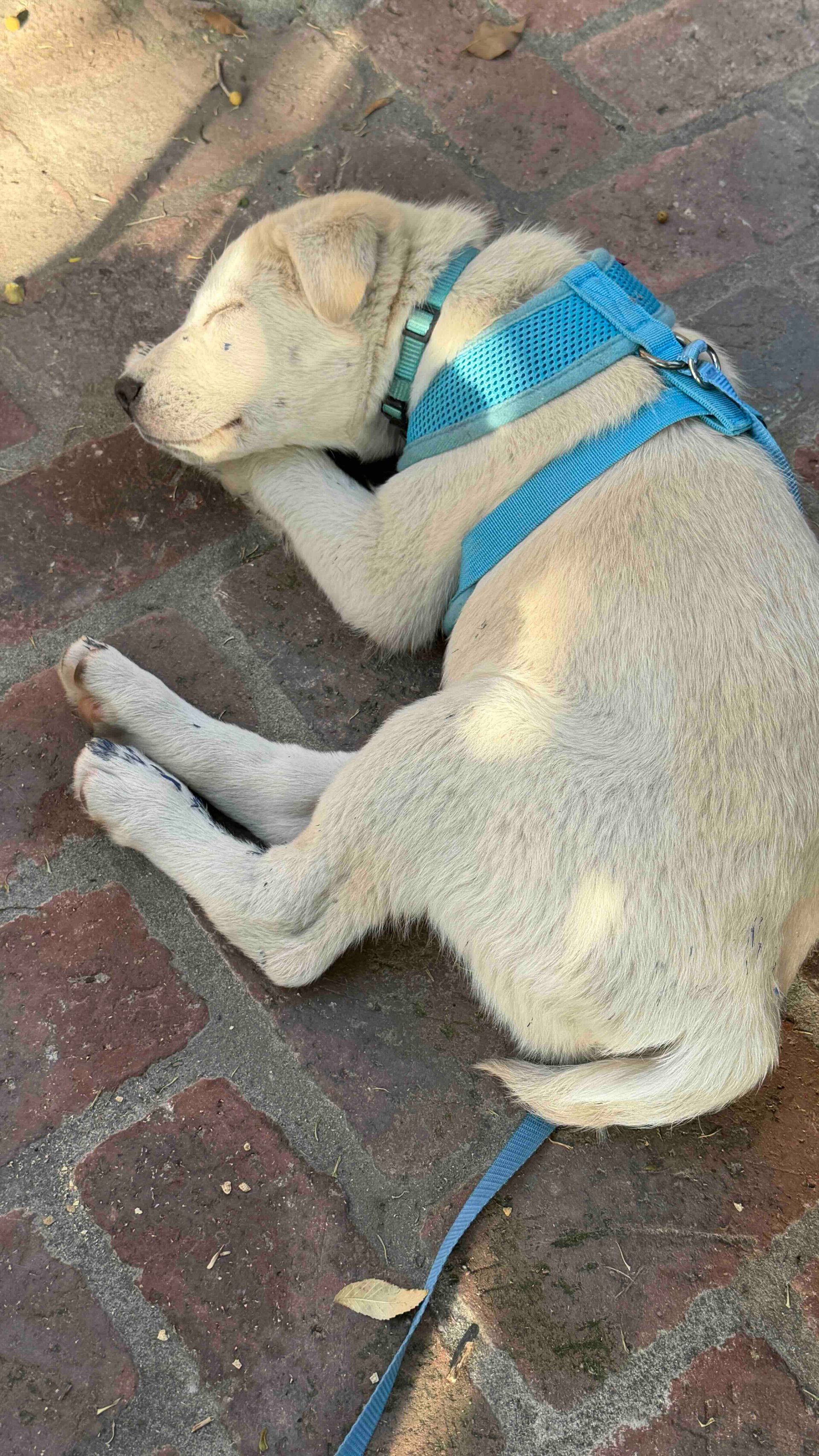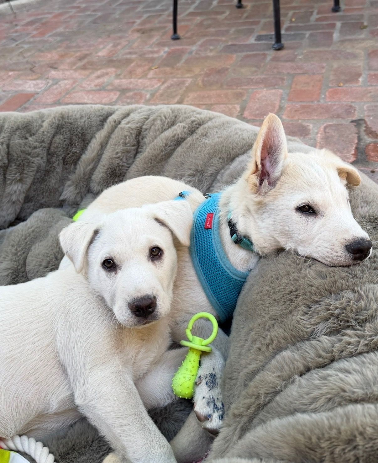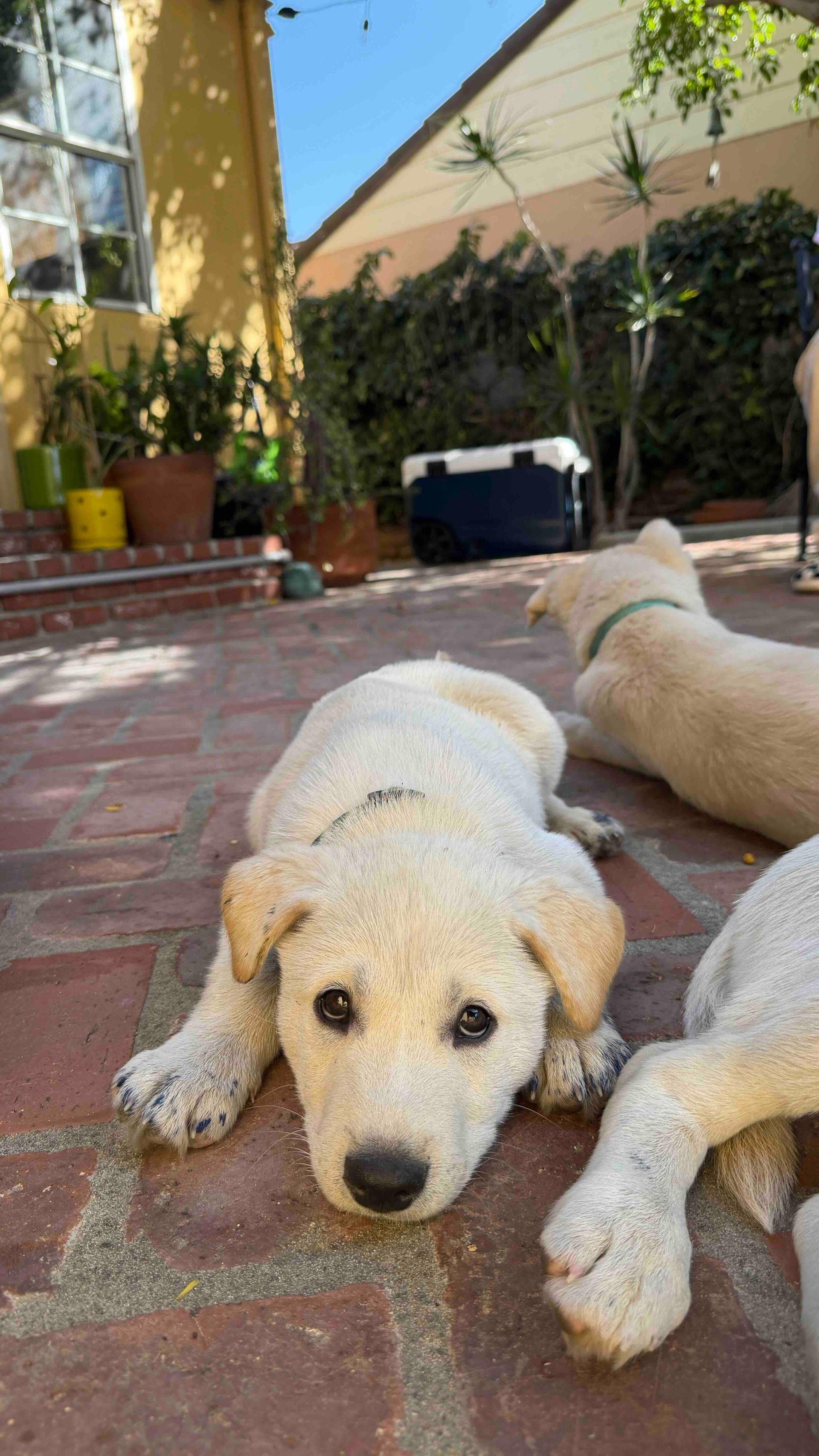 She and her brothers were found in skid row with their mom covered in blue paint. Farrow is the biggest of the litter with long model legs and a face that gives lab. She will likely be anywhere from 40-60lbs full grown (but that’s just a guess) She is a playful puppy with tons of energy. Follow her hashtag #maedayfarrow