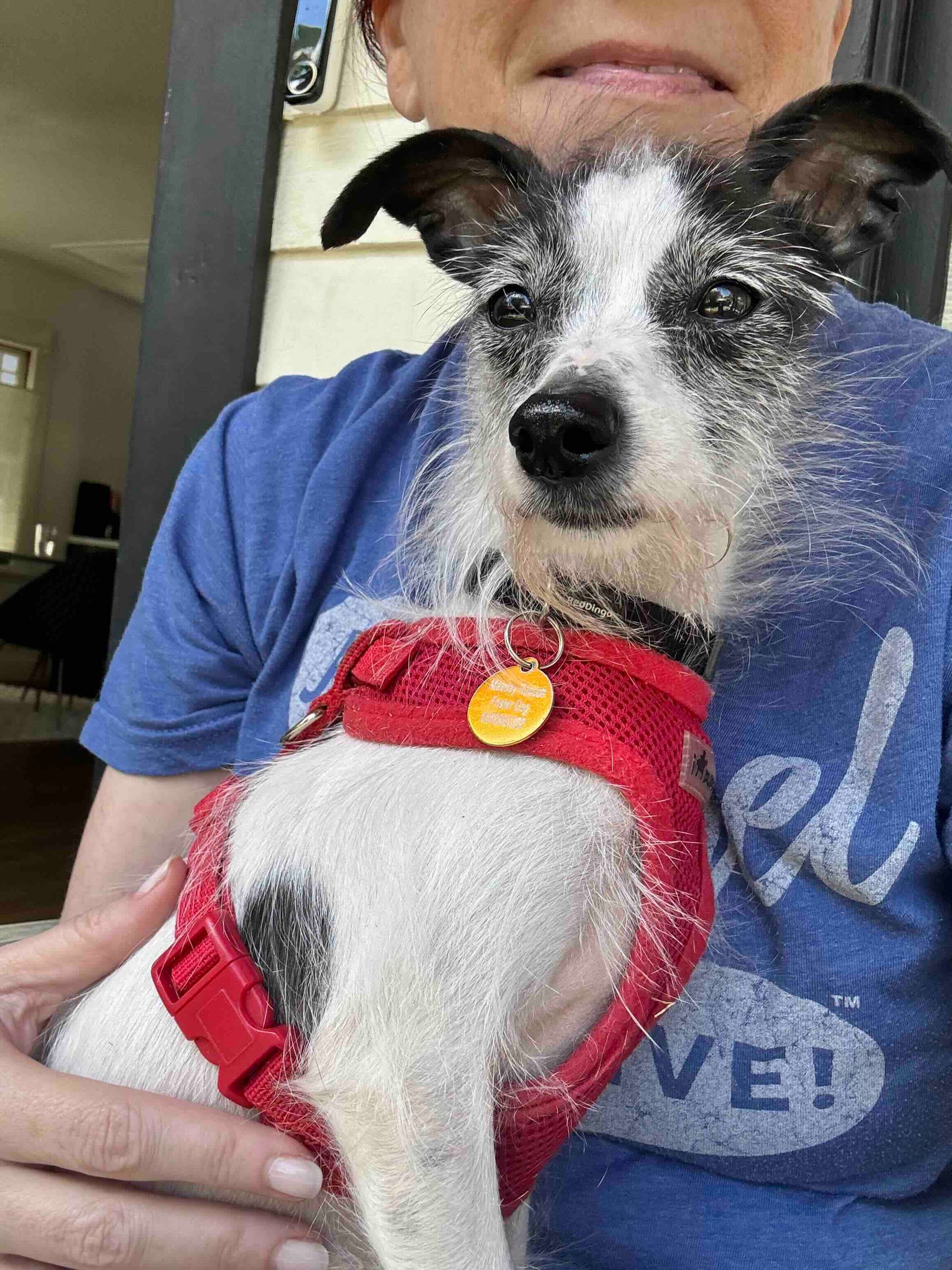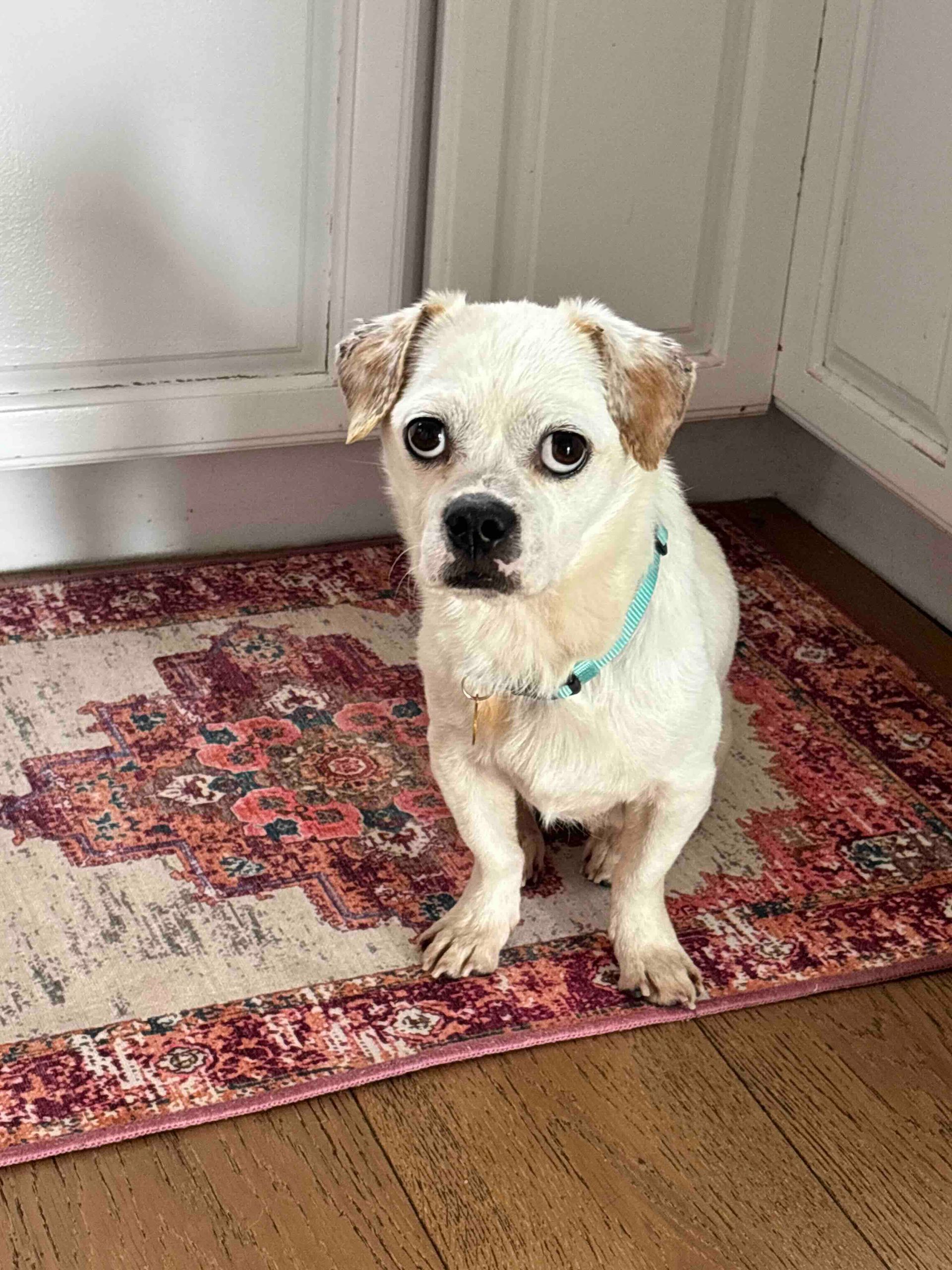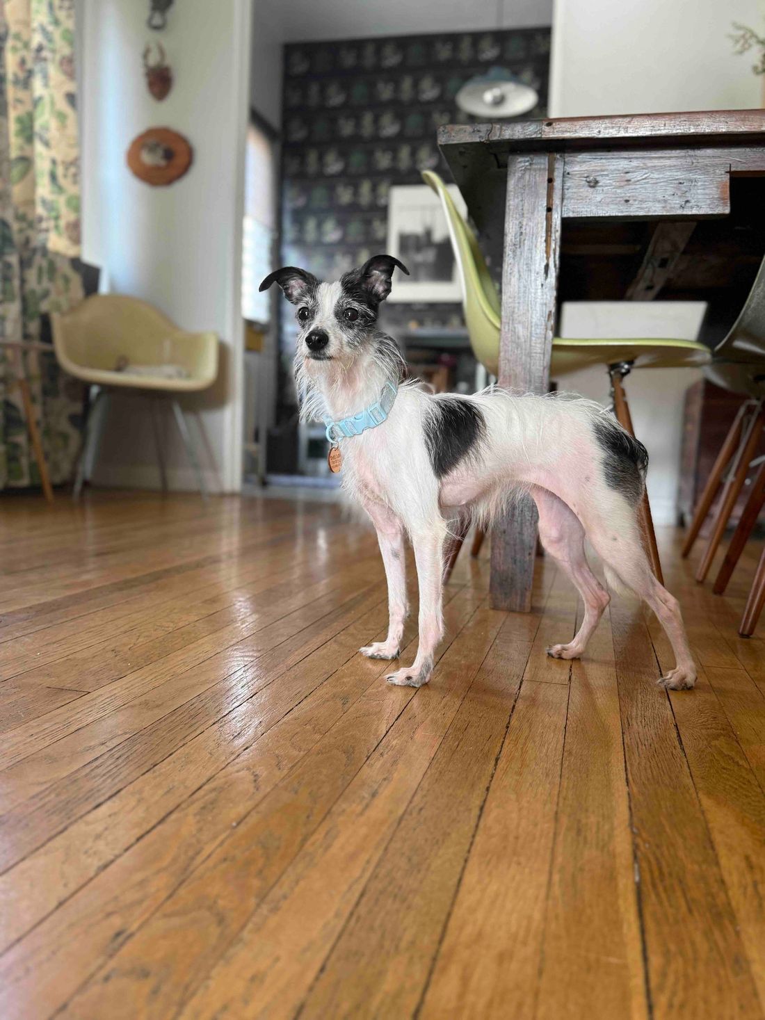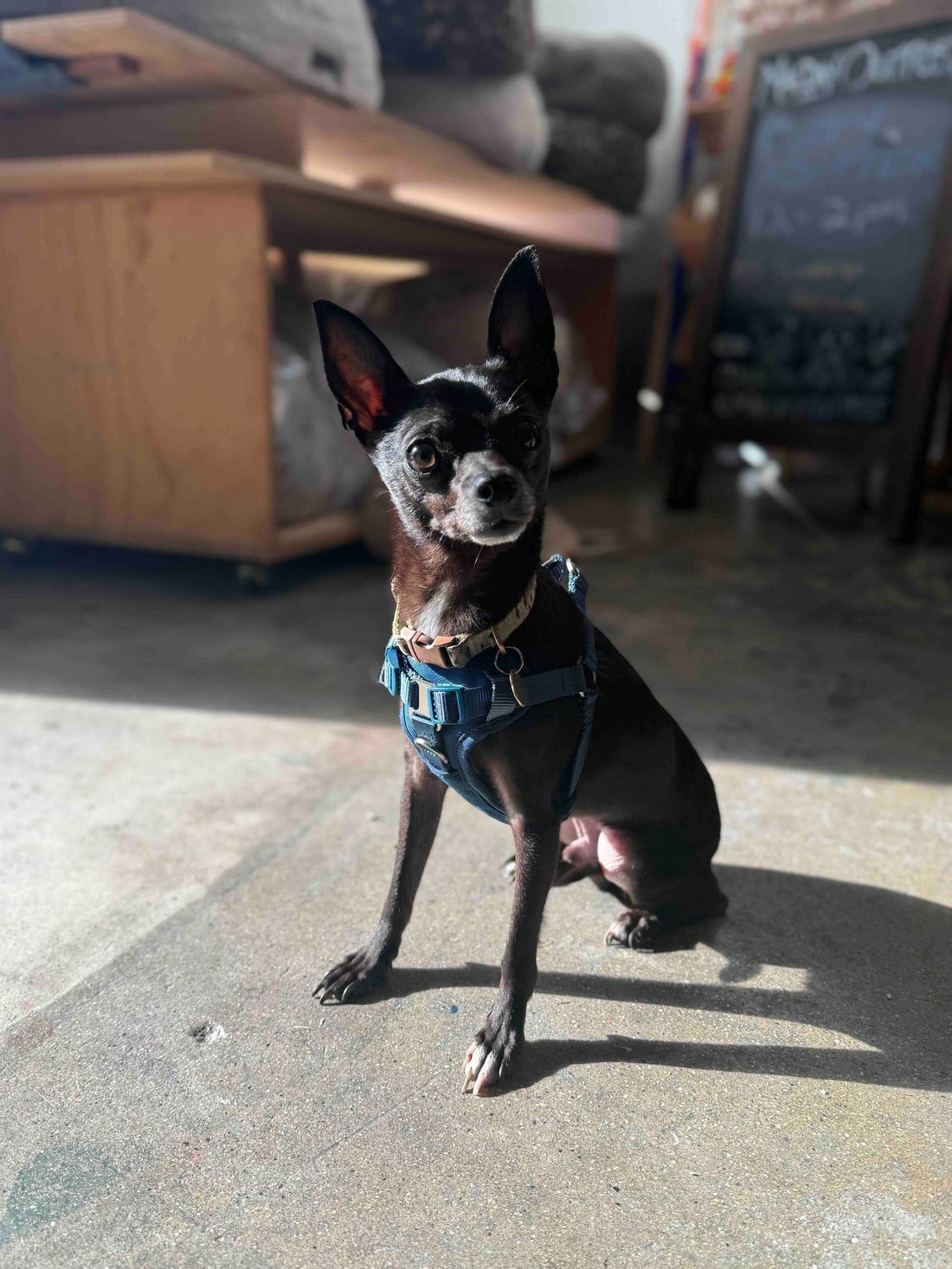 Olive Oyl is approximately 6-8 years old, 8 lbs, potty trained, and great with other dogs AND cats— she’d probably prefer a pup pal in her forever home to show her the ropes and help her gain confidence.