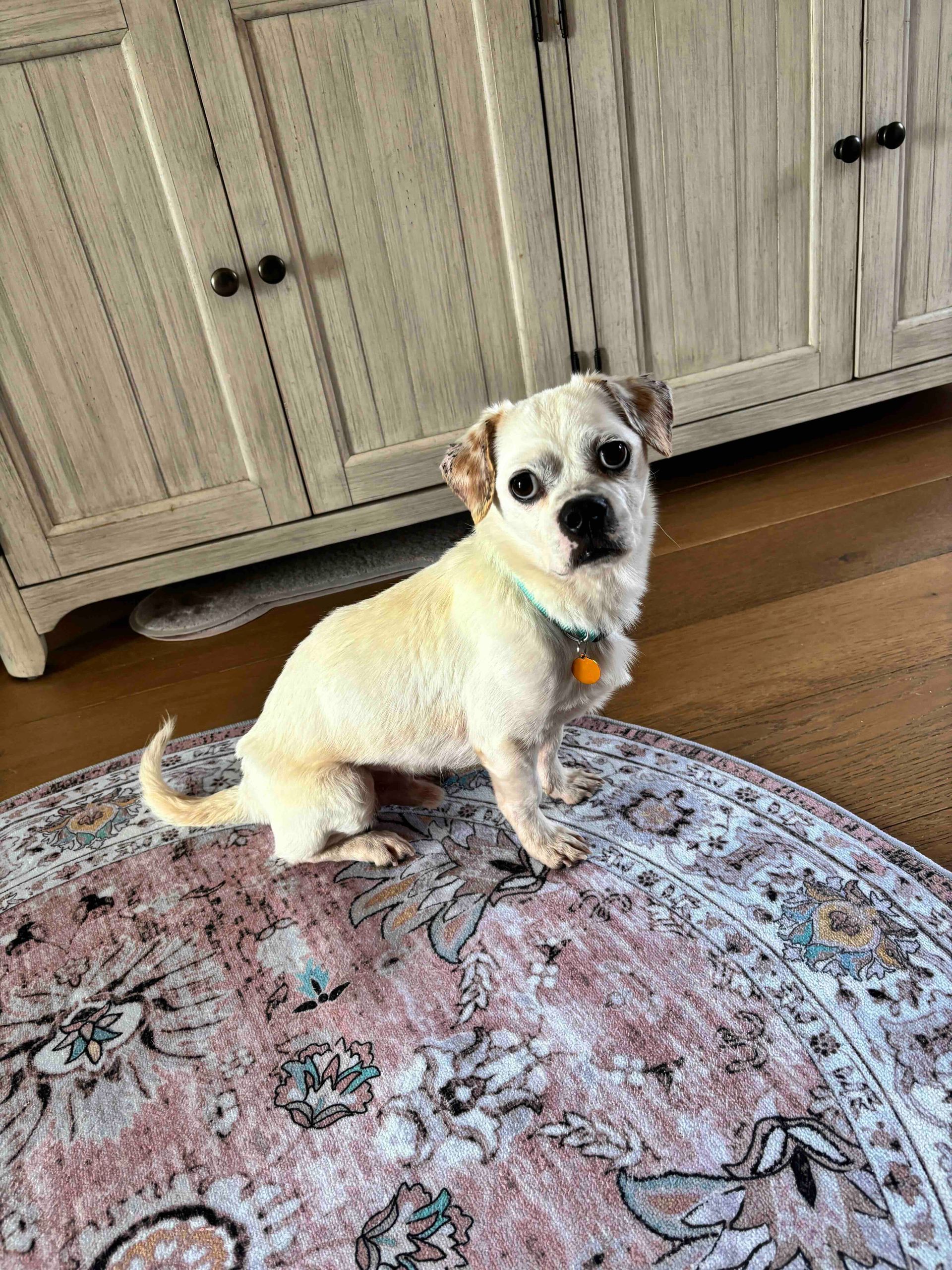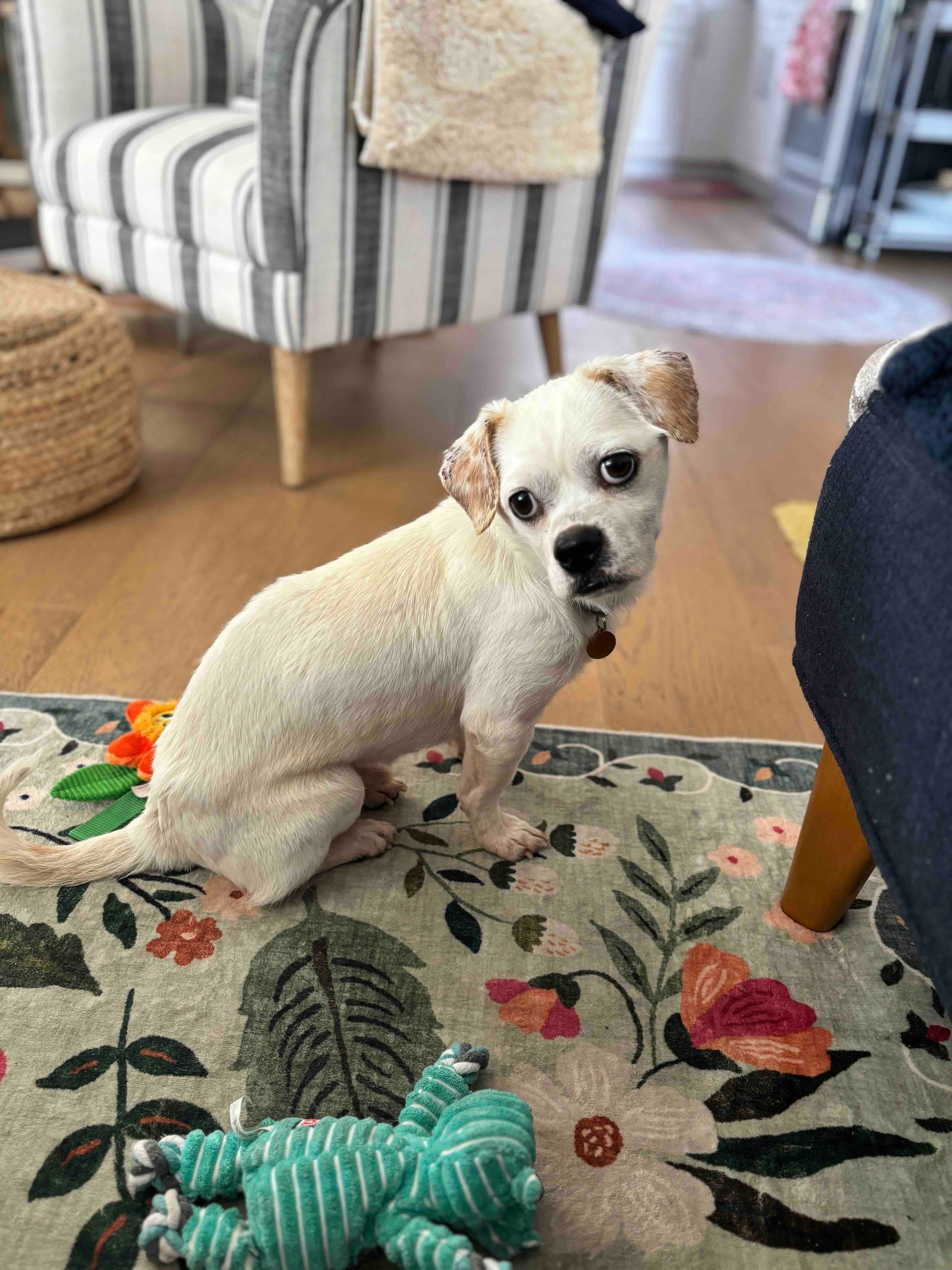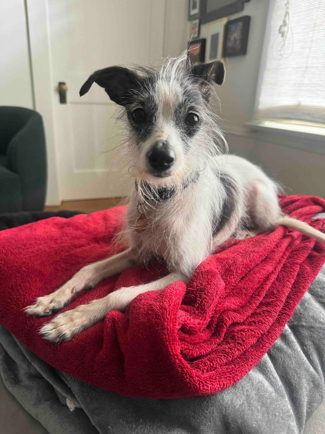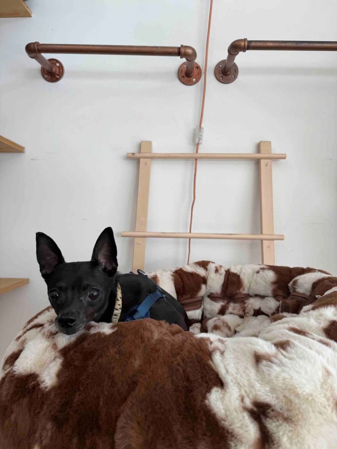 Olive Oyl is approximately 6-8 years old, 8 lbs, potty trained, and great with other dogs AND cats— she’d probably prefer a pup pal in her forever home to show her the ropes and help her gain confidence.