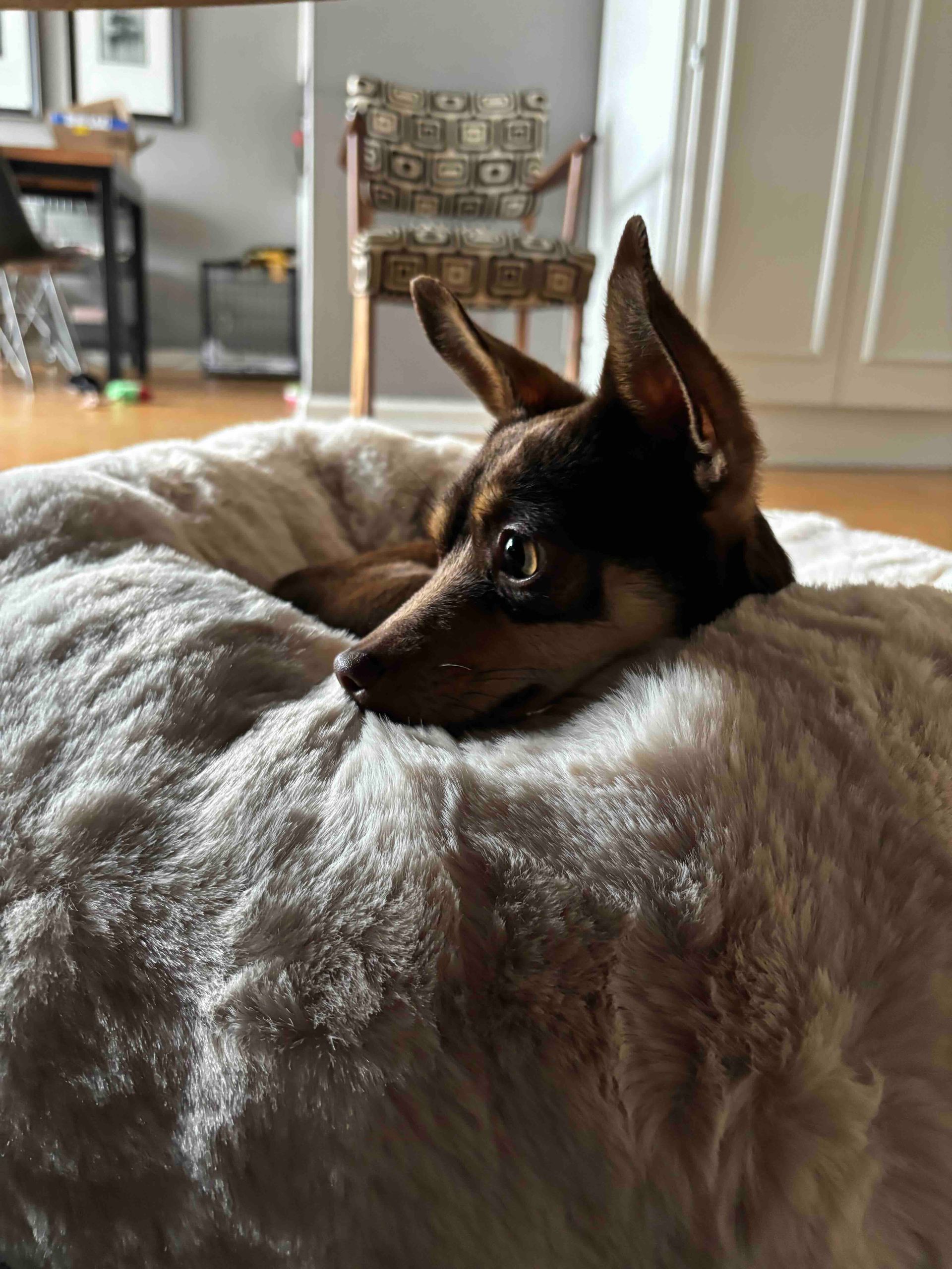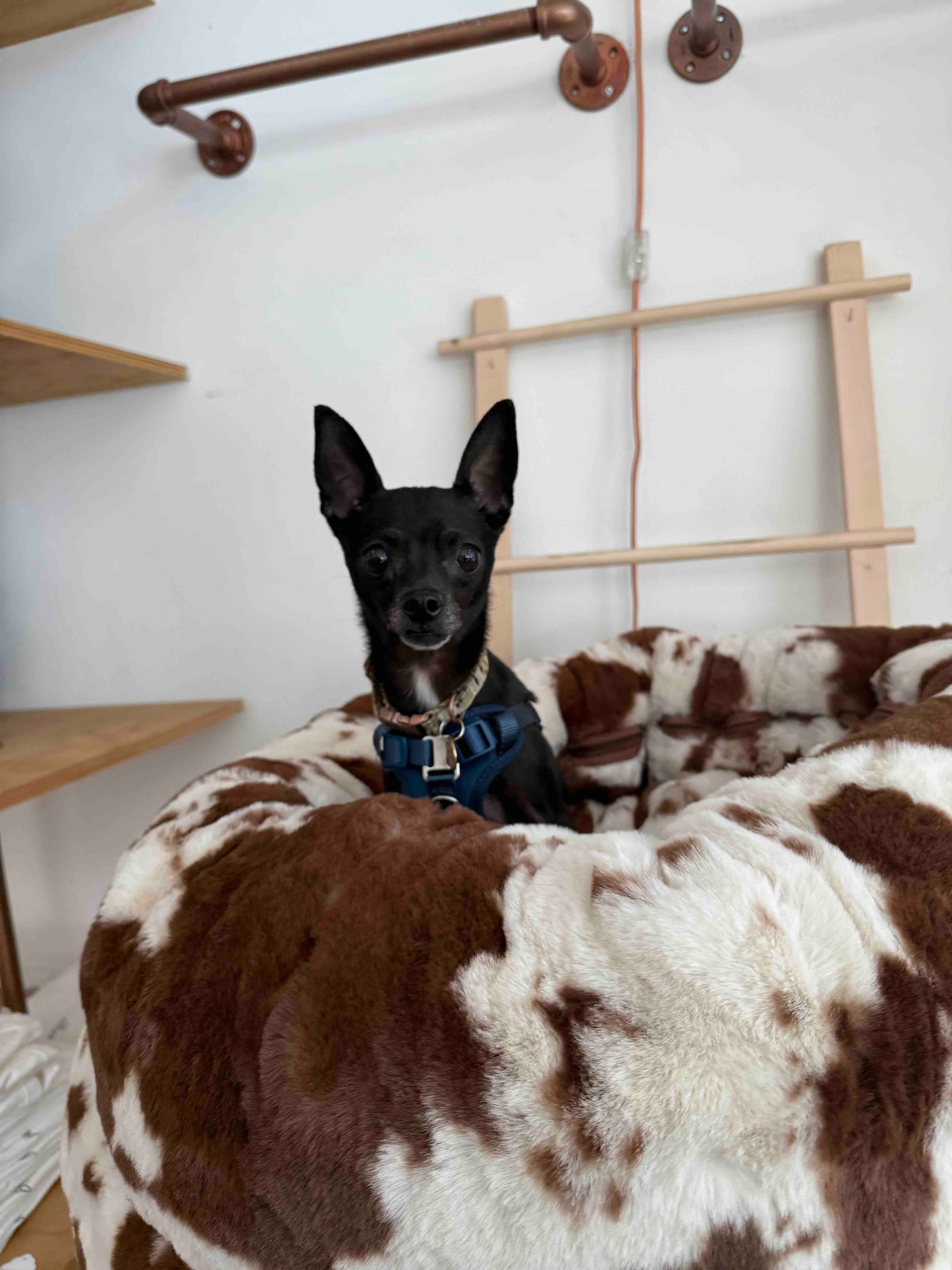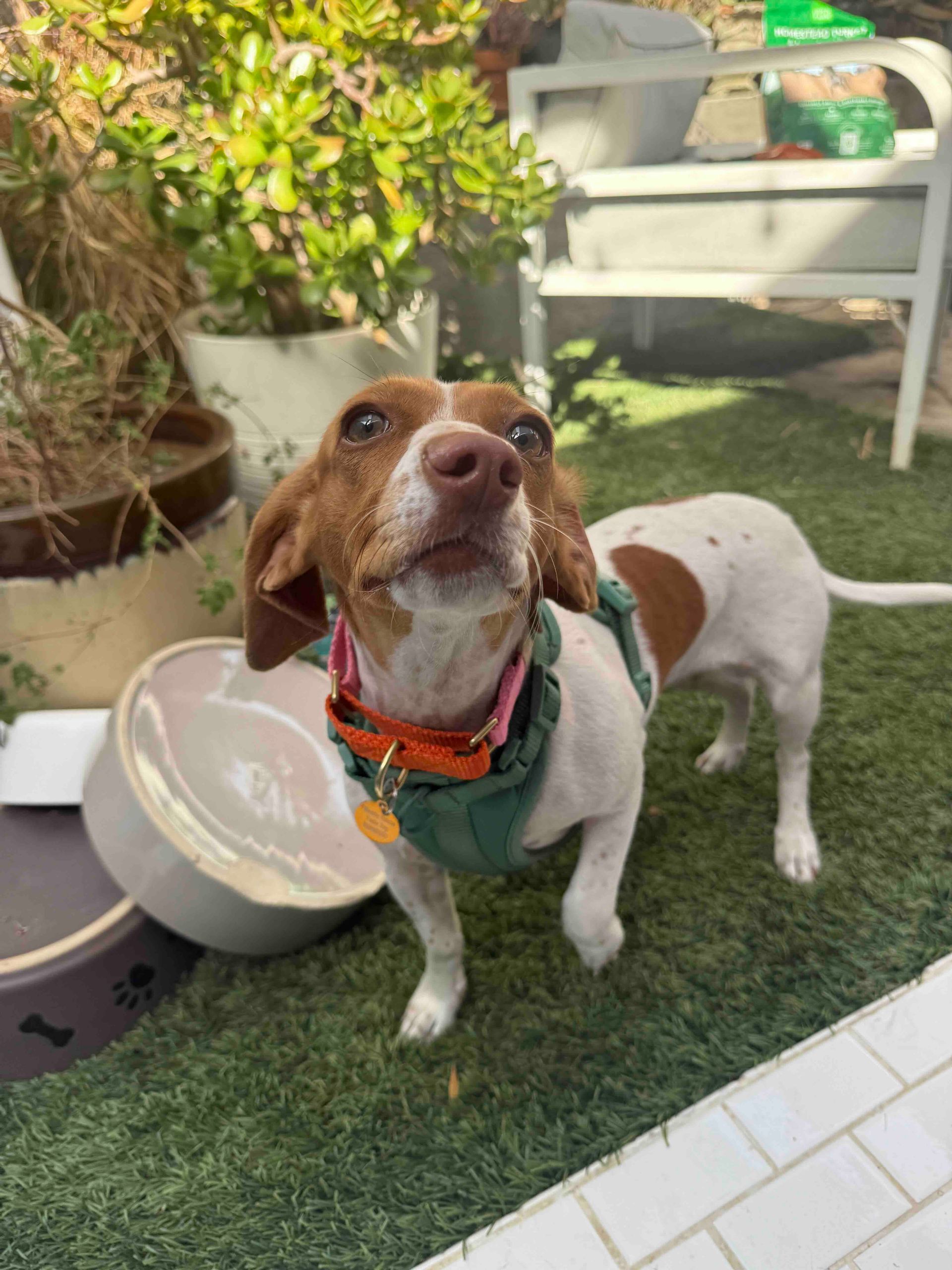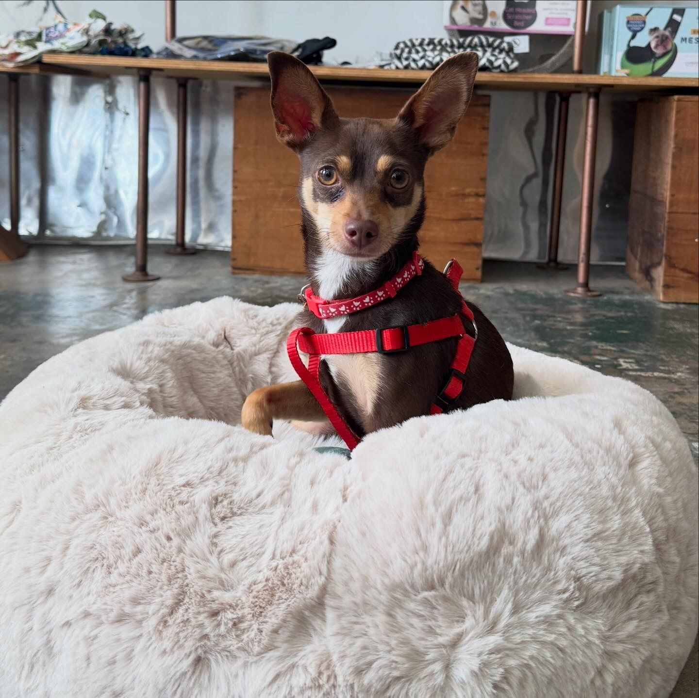 Olive Oyl is approximately 6-8 years old, 8 lbs, potty trained, and great with other dogs AND cats— she’d probably prefer a pup pal in her forever home to show her the ropes and help her gain confidence.