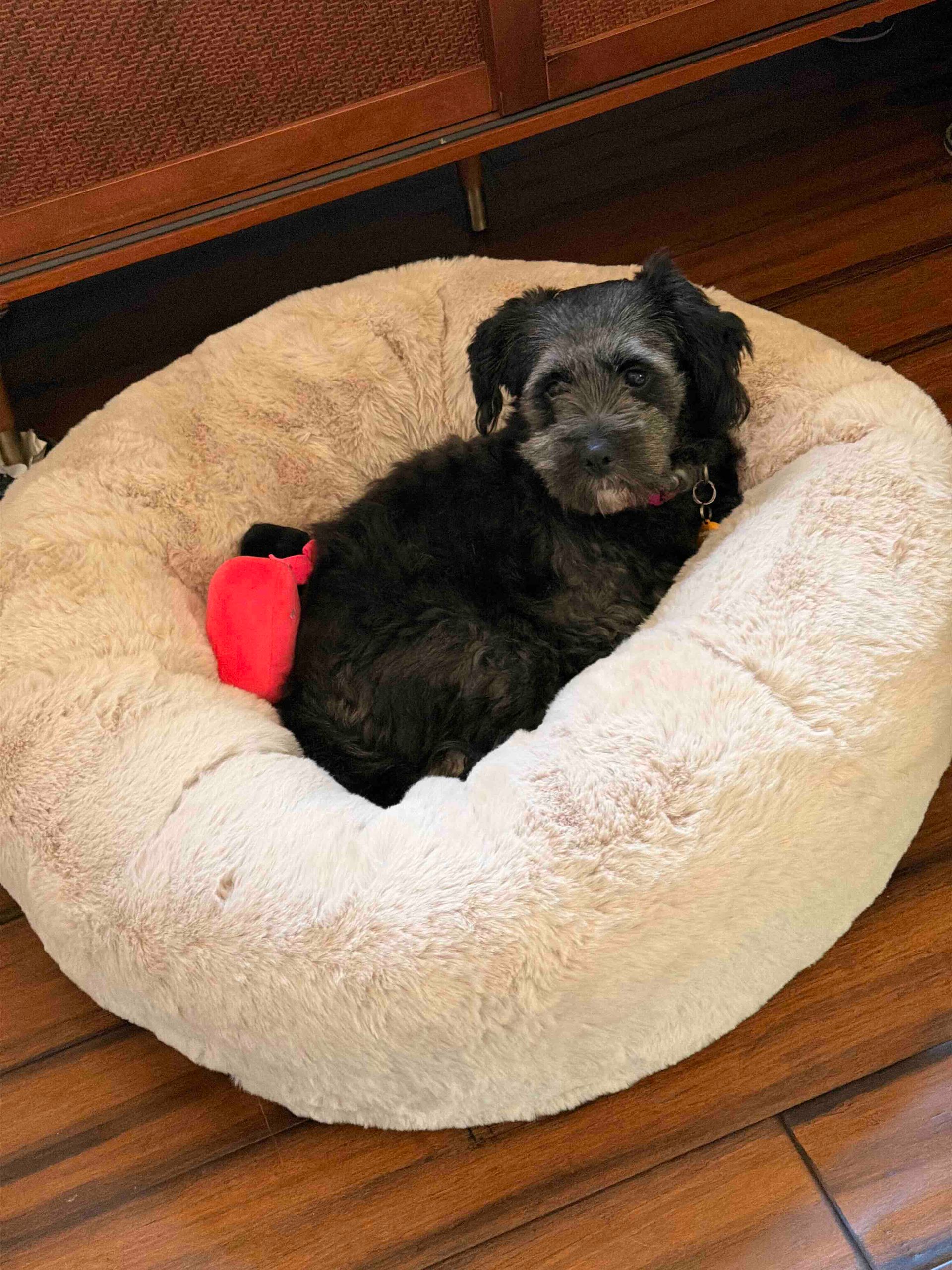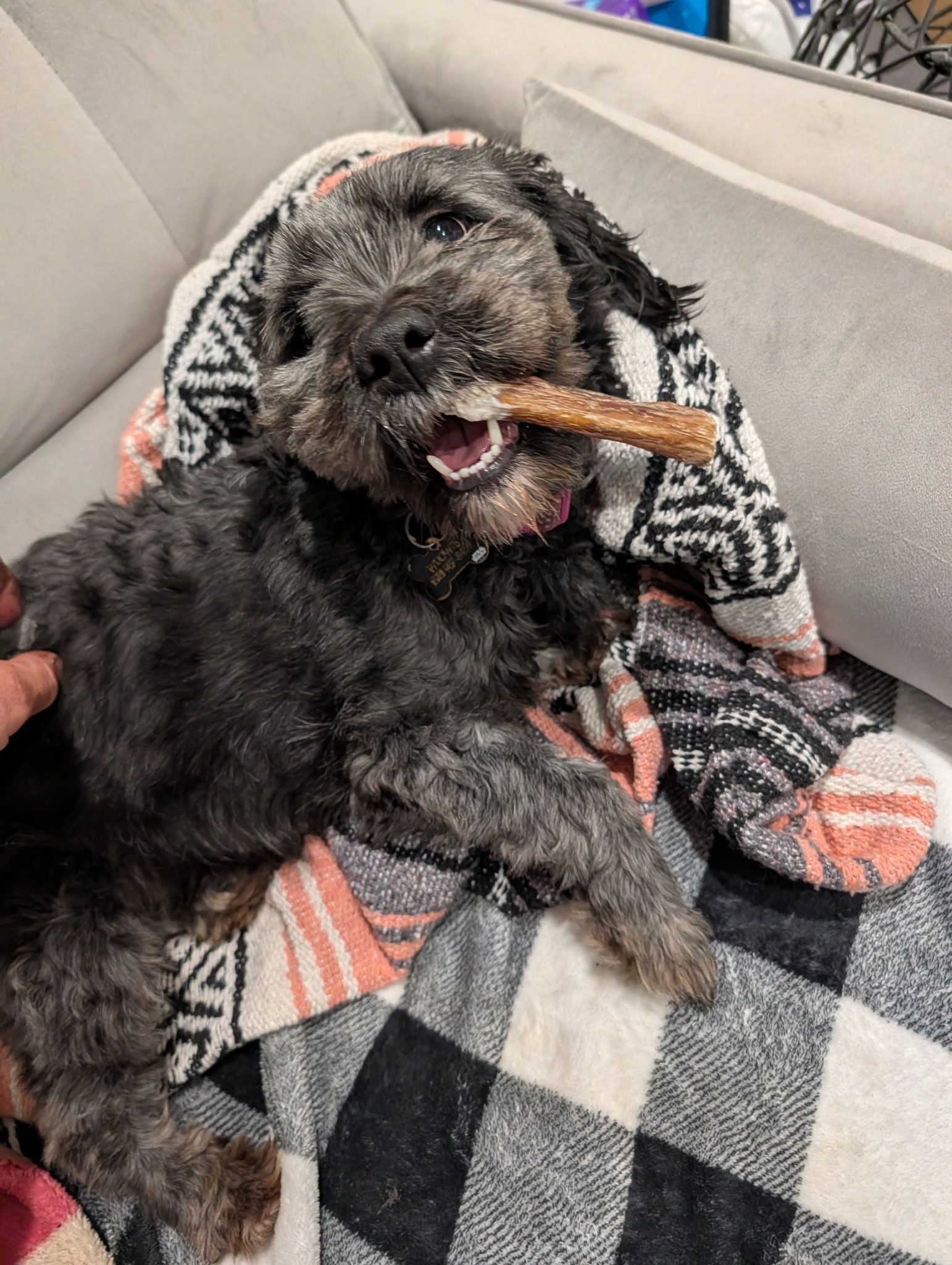 and is the smallest of the pups. Their tail looks like a frenchie or pug tail and they will be smaller than the two littermates once they are full grown. Behr is the sweetest, but was born with hypospadias, a very rare genetic mutation which means they have both female & male genitalia. So far Behr is using the bathroom properly and Behr is acting like a normal puppy. We don’t know if this means they have any female internal organs or male. We are currently working with a specialist to figure out next steps.